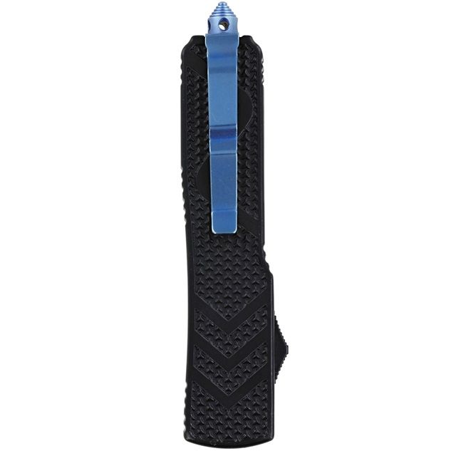 Tarantula Black D/A OTF Automatic Knife Etched Blue Tanto Blade. Specifications: Blade material: Stainless steel Handle material: Black polymer Blade style: Tanto Blade finish: Sky blue Handle finish: Textured Includes: Black nylon pouch, pocket clip (blue to match the blade), screws Mechanism: Automatic out-the-front (OTF) Features: Tanto Blade Style Bold sky blue finish Etched design Textured black handle for secure grip Non-slip grip