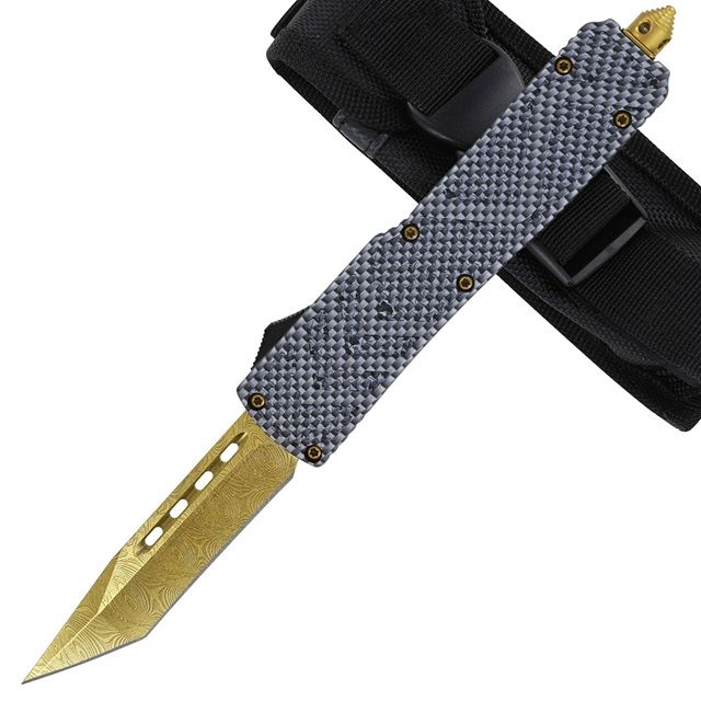 Tarantula Carbon Fiber D/A OTF Automatic Knife Etched Gold Tanto Blade. Specifications: Blade material: Stainless steel Handle material: Silver carbon fiber Blade Style: Tanto Blade finish: Gold Handle finish: Textured Includes: Black nylon pouch, pocket clip, screws Size: Large Mechanism: Automatic out-the-front (OTF) Features: Etched design Textured silver carbon fiber handle for secure grip Non-slip grip on both sides of handle