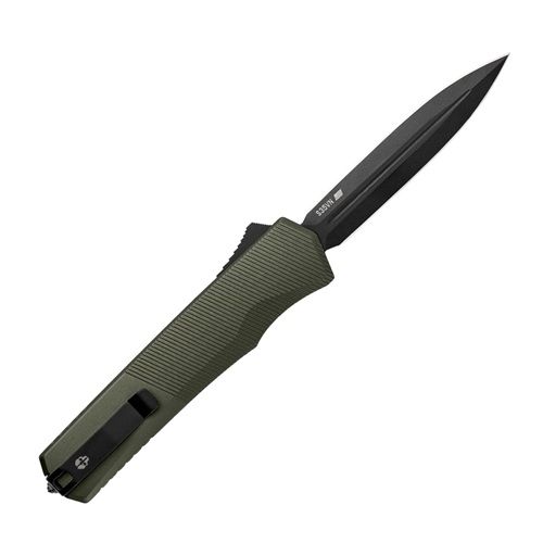 Tekto A5 SPRY D/A Green Automatic OTF Knife Black Dagger. A5 Spry is Tekto's most tactical knife. The A5 Spry is armed with a precision-contoured handle and a high-end S35VN steel blade, it's a blade of raw power and unmatched performance. Stealthy, compact, and lightweight, it boasts a lightning-fast automatic blade, iron-grip texture, and a contoured push button for instant action.