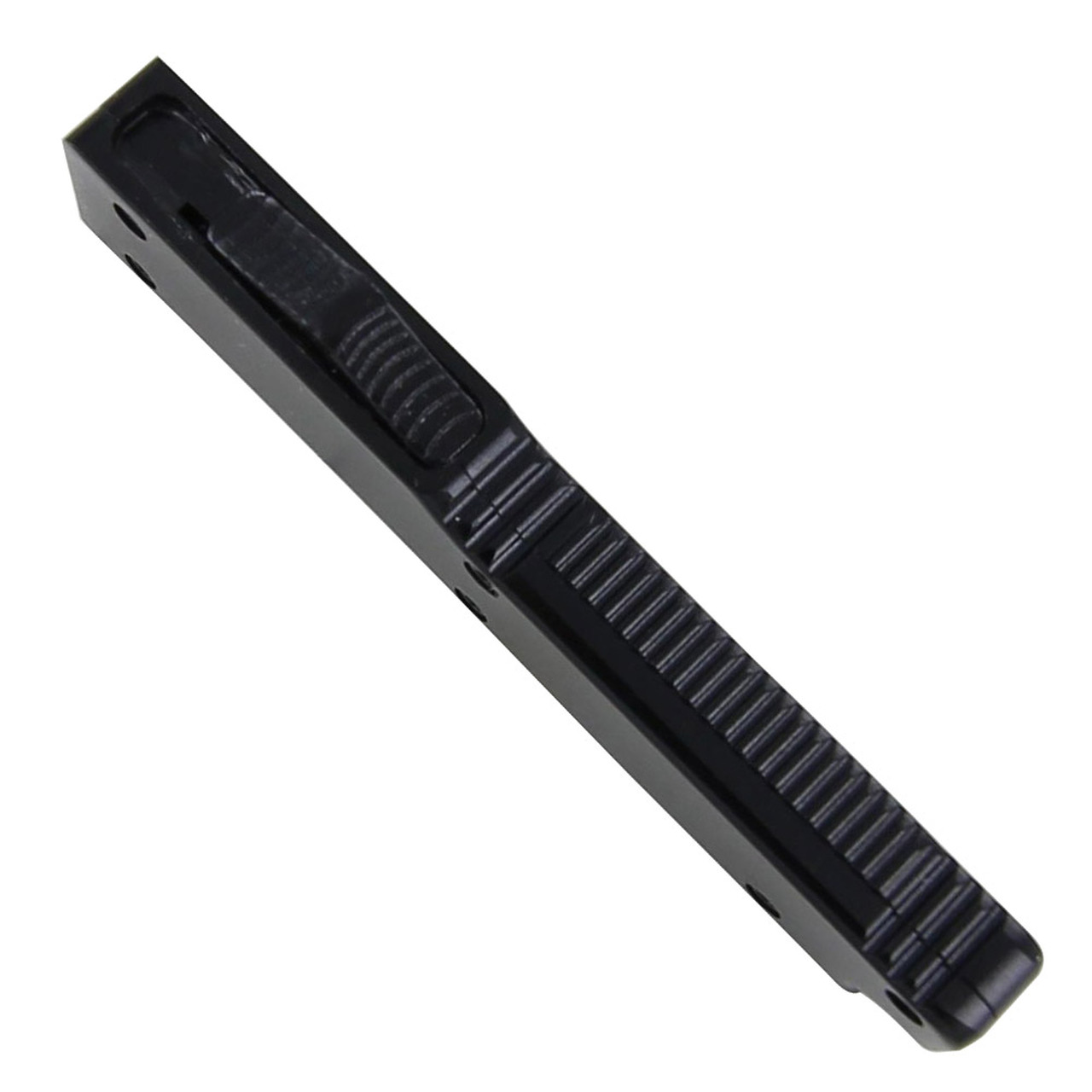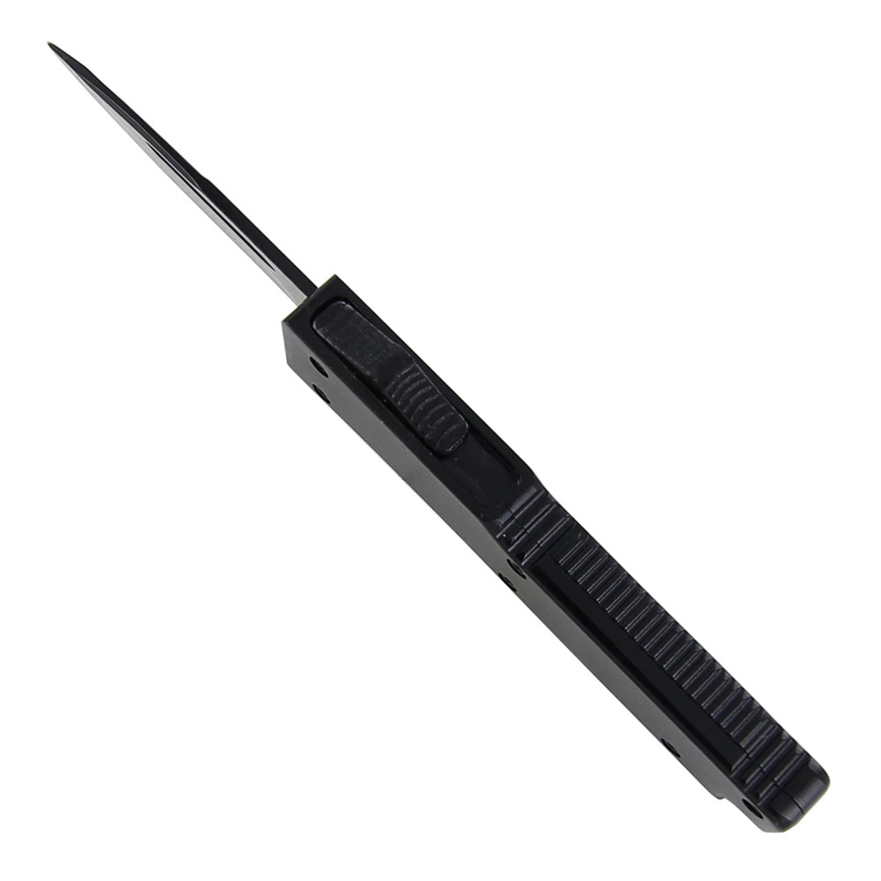 Thumb Flicker Mini Black D/A OTF Automatic Knife. This California Legal OTF Knife features a durable construction aluminum black finish handle with finger grip on the spine and belly with a dual action opening and closing push button. It comes with a drop point, two tone, stainless steel blade with a sharp edge and blood groove. Overall 5.25 Inch