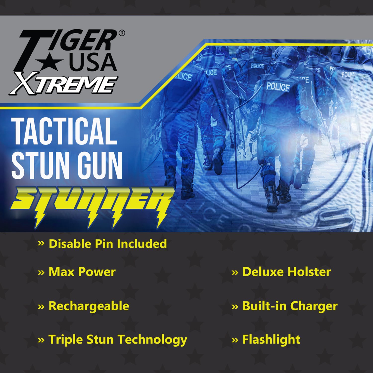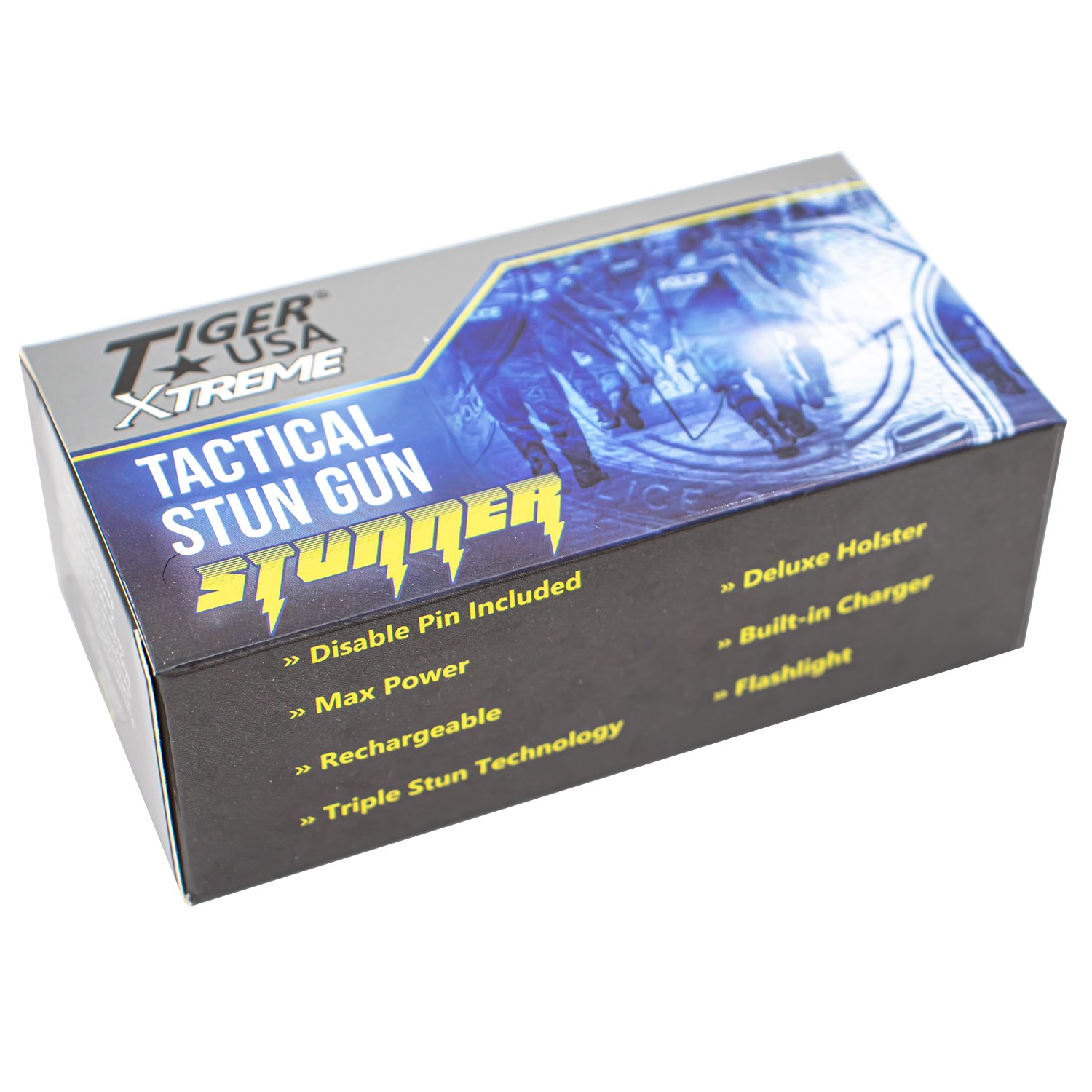 Tiger USA Extreme Black Rechargeable Stun Gun Flash Light 96 Million Volts. nylon carrying case Rechargeable battery Handy built-in charger in side of stun gun - Plugs into any A/C outlet 96 million volts of powerful charge! Kill switch included.