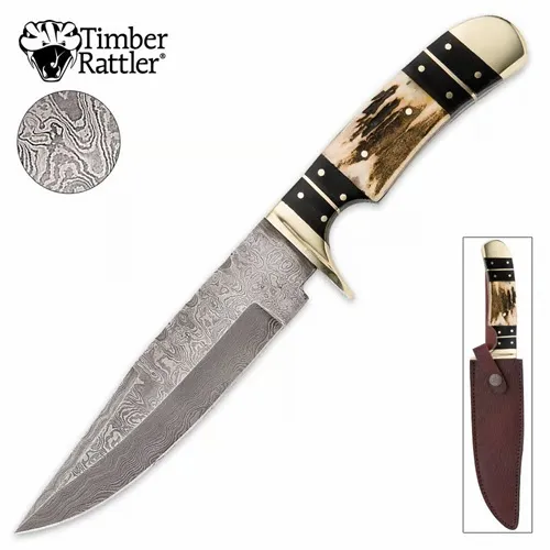Timber Rattler Colorado Hunter Damascus Knife. The Timber Rattler Colorado Hunter Knife is built for hard use but doesn’t skip on craftsmanship. Its 6 3/4" full-tang Damascus steel blade features distinctive wave-like patterns and a drop point profile that’s ready for hunting, camp prep, or everyday utility. Decorative file work on the spine adds a handcrafted touch that makes each knife feel personal. The handle pairs genuine stag with dark buffalo horn for a mix of rugged texture and natural polish. Brass pins, a guard, and a pommel complete the look while offering stability and balance. At 12" overall, this fixed blade is equally suited for outdoor carry or display. A genuine leather belt sheath is included for safe, reliable transport. FULL-TANG DAMASCUS STEEL BLADE: A 6 3/4" drop point blade with striking, unique patterns. GENUINE STAG AND BUFFALO HORN HANDLE: Offers natural beauty and durability with a secure grip. BRASS GUARD AND POMMEL: Provides added strength, balance, and an elegant finish. HANDCRAFTED DETAILS: Delicate file work and rustic jigging add to the knife’s artisanal appeal. INCLUDES GENUINE LEATHER SHEATH: Protects the knife and offers convenient belt carry.