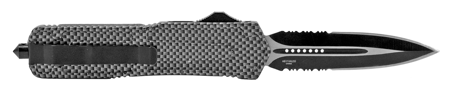 Titan Carbon Fiber OTF Automatic Knife Black Dagger Double Serrated. Blade Material 440 Stainless Steel Blade Type Dual Serrated Folding Action Out the Front Handle Construction Stainless Steel Features Belt Clip, Glass Breaker, and Nylon Carrying Case Blade Length 3.5" Handle Length 5.13" Overall Length 8.63"