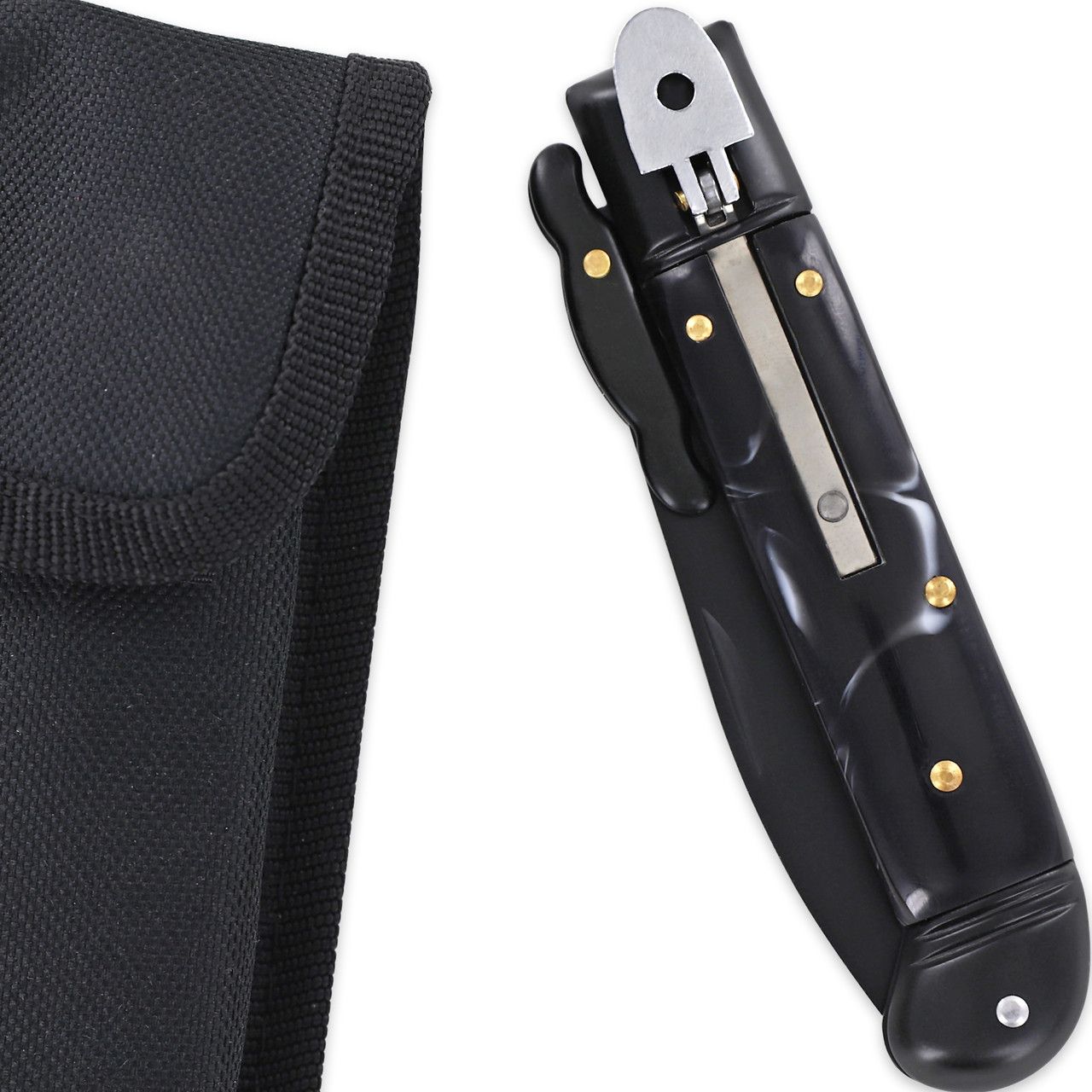Touch of Destiny All Black Marble Swinguard Automatic Lever Lock Stiletto Knife. The knives are lever lock however they have a feature unique from other lever locks: a stiletto-like bolster that springs up and into place horizontally when the blade is deployed and retracts to natural position as the blade is retracted. The bottom bolster is angled toward the blade which provides stable grip. Each knife comes with its own black nylon sheath for safe storage and convenient carry. Overall Length: 8.12 Inches (Open). Weight: 0.3 lbs.