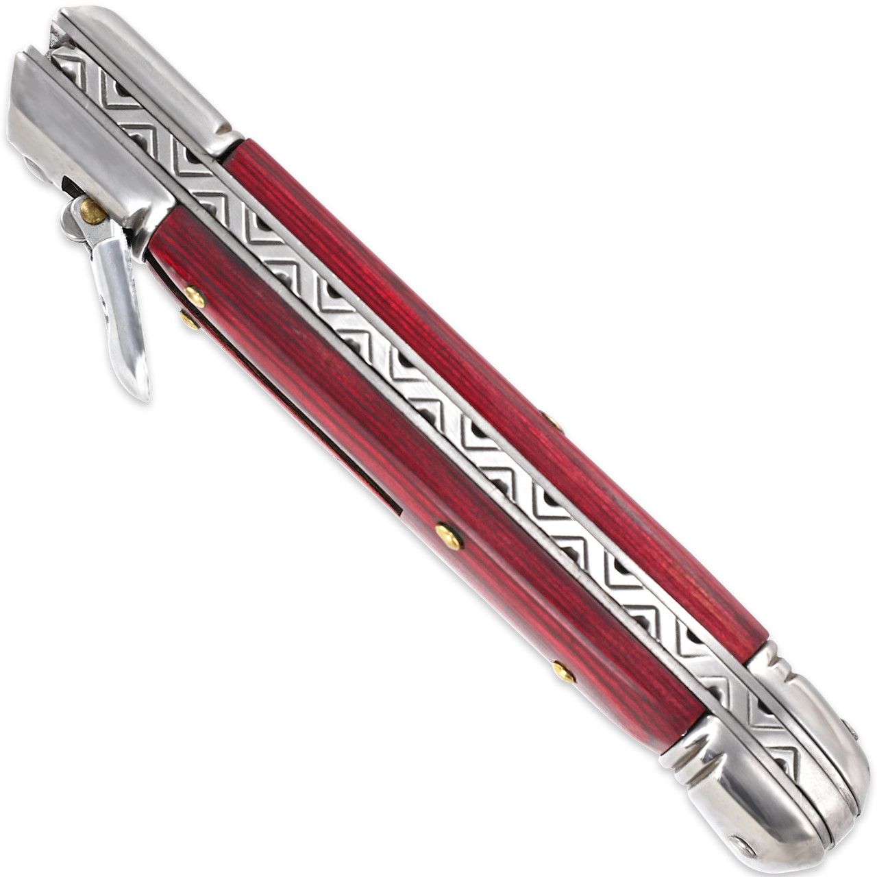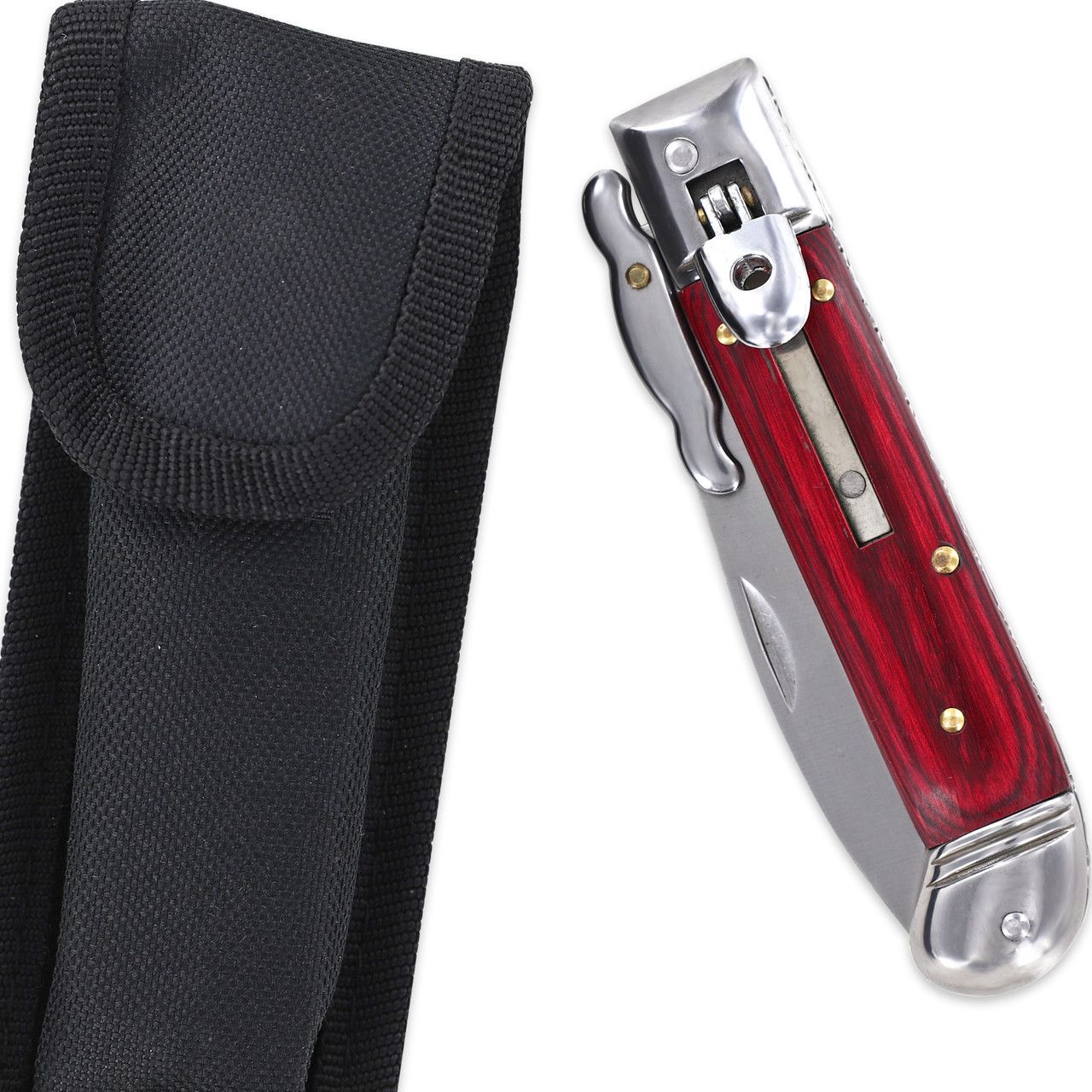 Touch of Destiny Rosewood Swinguard Automatic Lever Lock Stiletto Knife. The knives are lever lock however they have a feature unique from other lever locks: a stiletto-like bolster that springs up and into place horizontally when the blade is deployed and retracts to natural position as the blade is retracted. The bottom bolster is angled toward the blade which provides stable grip. Each knife comes with its own black nylon sheath for safe storage and convenient carry. Overall Length: 8.12 Inches (Open). Weight: 0.3 lbs.