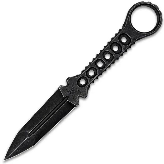 The M48 Tanker Combat Dagger is an absolute beast of a fixed blade knife that’s built for defense when things get out of control It has a one-piece, CNC machined 3Cr13 stainless steel, solid and heavy-duty construction with a stonewashed finish The dagger has a hefty, 4 1/4” double-edged blade that goes down to a sharp penetrating point and it has a blood groove The ridged and perforated handle is grippy and the open-ring pommel provides an extra measure of control when using The 9 1/2” overall combat dagger snaps securely into a tough Kydex sheath with a metal belt clip and lashing holes