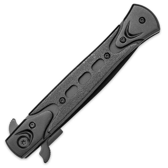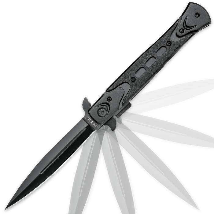 The Rampage Assisted Opening Stiletto from United Cutlery opens with the speed of an expensive, high-end knife at a tenth of the price. The razor sharp 4" stiletto point, black-coated stainless steel blade offers a blade spur equipped with an advanced assisted opening mechanism for speedy, one-handed opening. This innovative stiletto also offers a remote pocket opener, allowing you to deploy the blade as you remove it from your pocket! The slim profile is hardly felt in a pocket, but when the blade is deployed, it transforms into a fearsome self defense knife. Thumb stud, blade spur and remote opener Sturdy integrated pocket clip Closed length: 5"