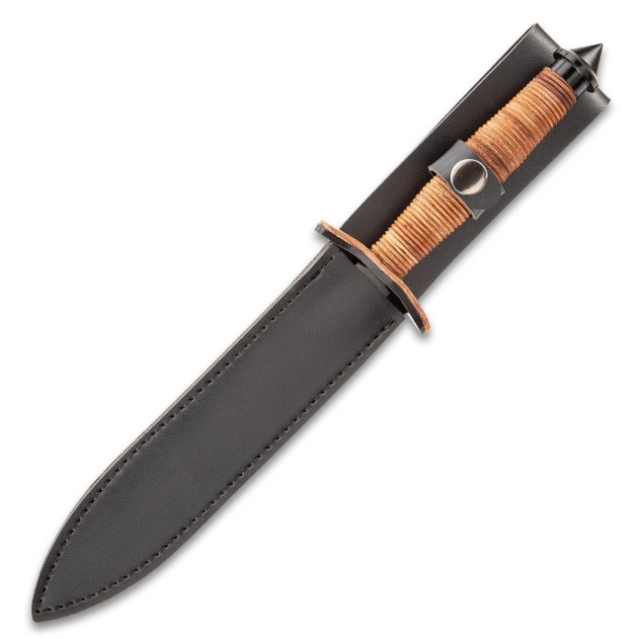 V 42 Military 12" Stiletto Black Dagger Full Tang. Razor-sharp, double -edged stiletto blade Stacked leather handle with cast thumb notches Includes custom leather sheath Measures: 7.25" blade; 12 5/8" overall